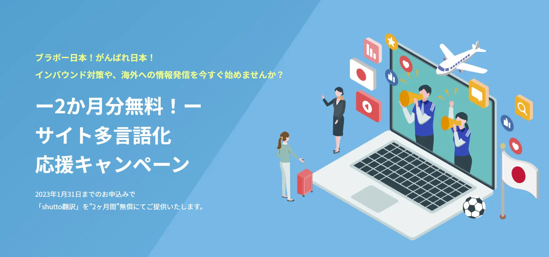 サイト多言語化応援キャンペーン!どのプランでも”2か月分”が無料!インバウンド回復の兆しの今!訪日対策や、海外への情報発信を今すぐ始めませんか?~Webサイト多言語化ツール「shutto翻訳」