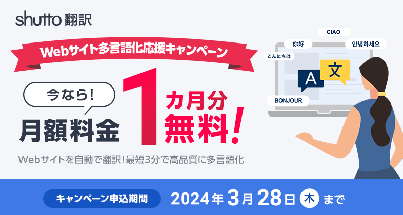 今なら1ヶ月分無料! Webサイト多言語化応援キャンペーン、2024年3月28日まで実施中