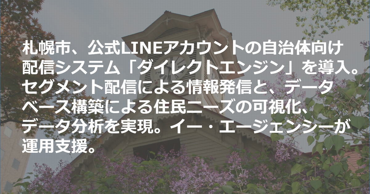 札幌市公式LINEアカウントの配信システムを「DirectEngine(ダイレクトエンジン)」にて構築。セグメント配信による情報発信と、レポーティング機能による住民ニーズの可視化、データ分析を実現。イー・エージェンシーが運用支援。