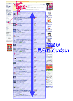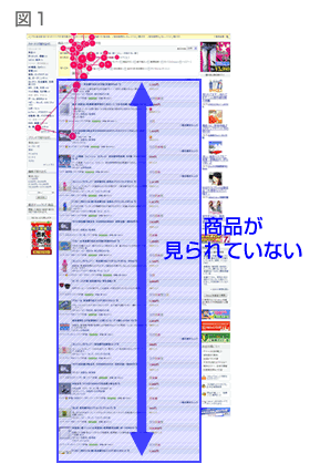 どちらのページにおいても、結局ユーザーの欲しい商品はありませんでした。ただ、縦型表示では全く視界に入っていない商品が多数あった一方、碁盤型表示においては商品が一応一通り見られています。「チラ見しかされない商品棚」と「しっかり見られる商品棚」、商品が売れやすいのが後者であることは容易に想像がつきます。
