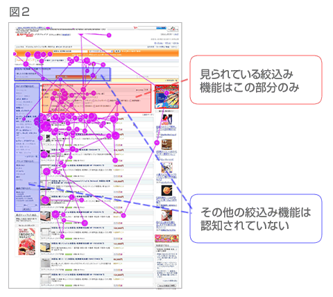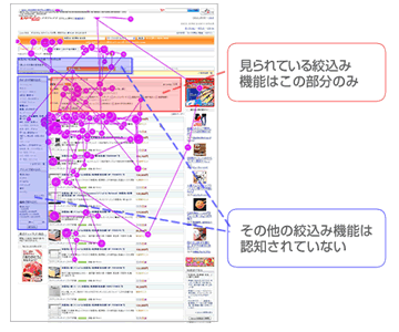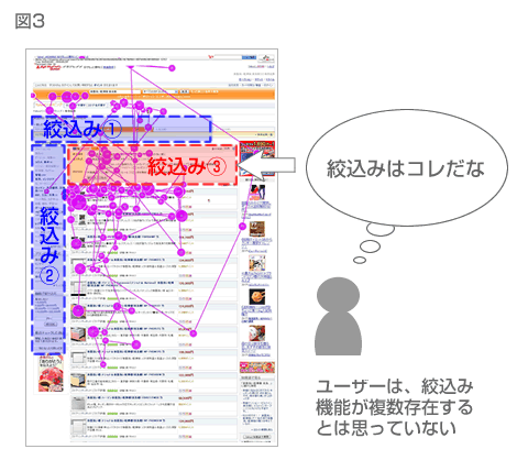 例えば、Yahoo!ショッピング一覧ページ内には、さまざま絞り込みのための機能やナビゲーションがあります。ただ、図3を見ると、それらの要素は画面内にバラバラと配置されていることがわかります。