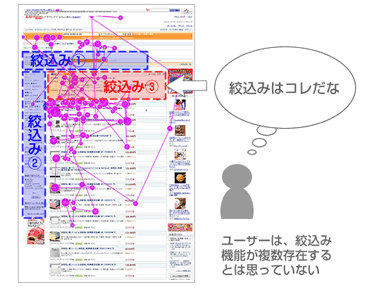 一方、ユーザーは、絞り込み機能(結果一覧上部)を1つ見つけた時点で、その同じ絞り込み機能を使い続けます。「絞り込みはココだ」と思いこんでしまい、同じ画面上に同タイプのツールが実は複数存在する、とは想像しにくいのです。