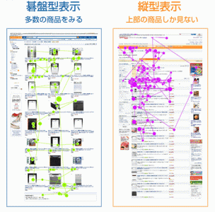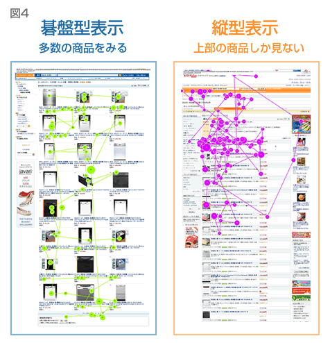 縦型表示の場合、被験者は上部数件を見ただけで、他のページへと遷移をしてしまいました。一方、碁盤型表示の場合、被験者は縦型表示よりも多数の商品に視線を向けていました。
