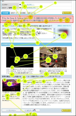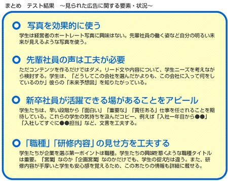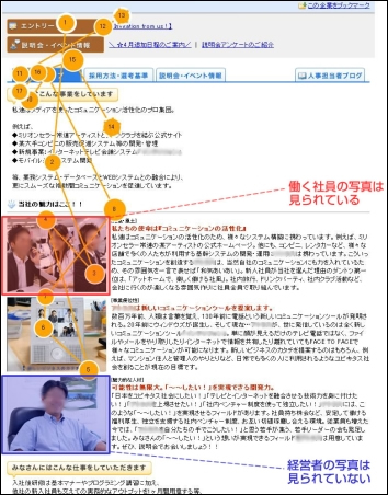 採用説明会は、新卒採用ならではの大きなイベントになりますが、意外と説明会の写真を使っている新卒サイトは少ないようです(今回のテストでは24社中1社のみ)。採用説明会の写真を上手に利用することで、新卒学生に向けて有効なアピールができそうです。