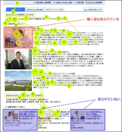 さらに注目したいのは、働く社員の写真(写真上段)は注視されていても、経営者の写真(写真下段)は見られていないということ。「経営者の写真はあまり見ない」――これは学生Dだけでなく、調査中のすべての学生に共通する傾向でした。