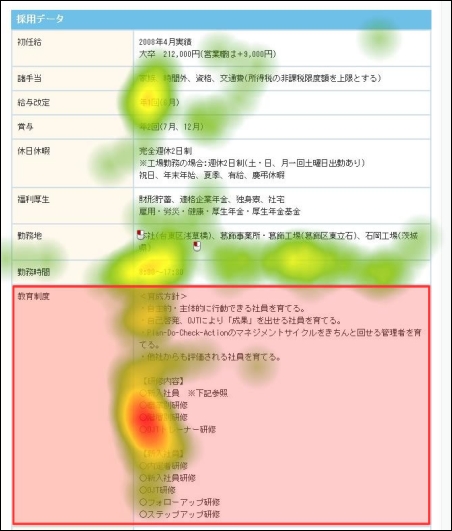 図5:視線の滞留時間をヒートマップで表した様子。長時間見られたところほど濃い赤色で表示されている。学生が「教育制度」をじっくり見ており、「給与」は確認程度であることがわかる