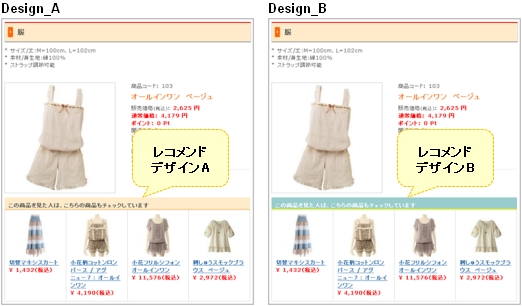 トーンの異なる2つのデザインにおいてデザインAの数値がBを上回る結果となりました。ページのトーンに合わせたデザインAはユーザーに違和感を抱かせることなく、レコメンド表示した商品を有効にクリックさせている結果となりました。