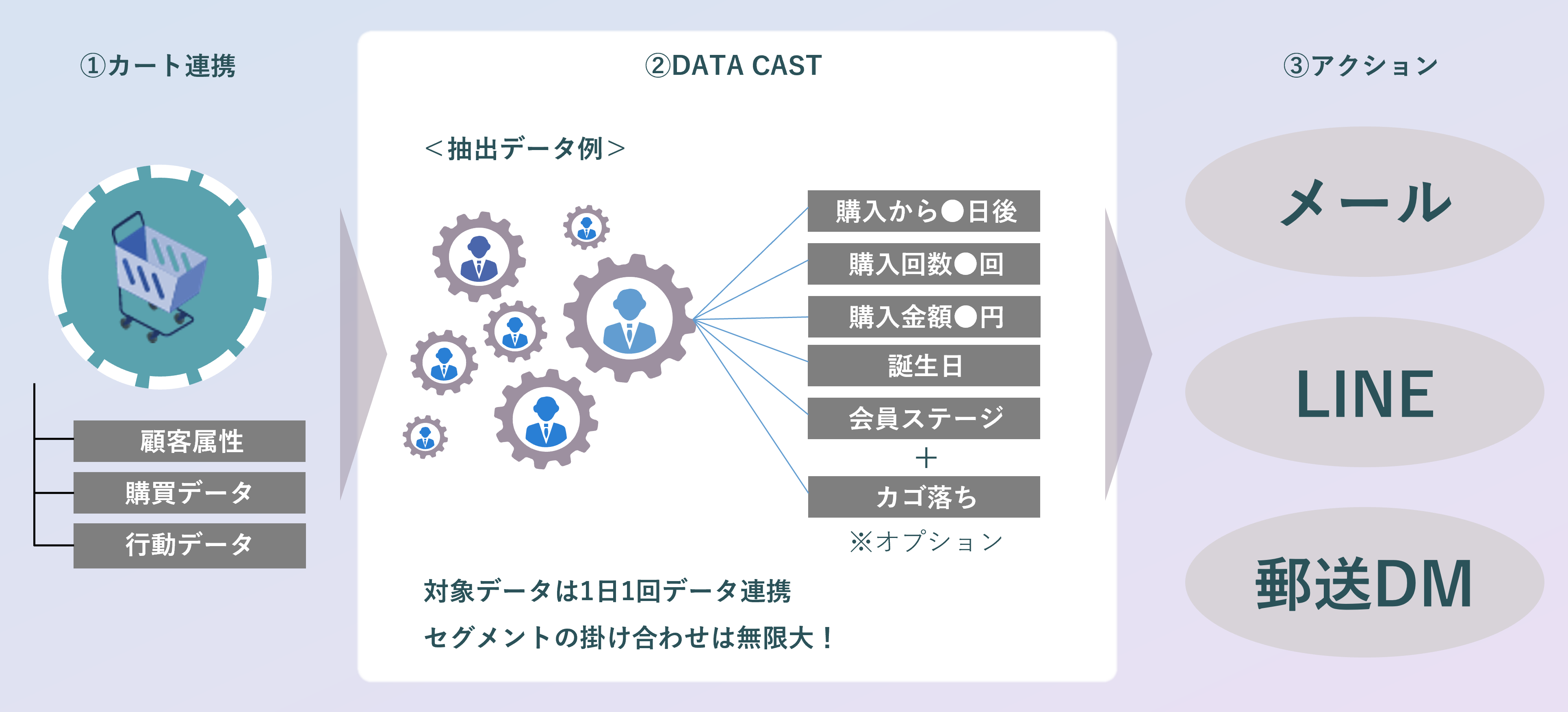 「DATA CAST」は、ECサイトで保有している会員情報や購買データ等を組み合わせてセグメントを行い、”個客”一人ひとりにあったコンテンツやタイミングに合わせてシナリオメールやLINEを送ることができるマーケティングプラットフォームです。