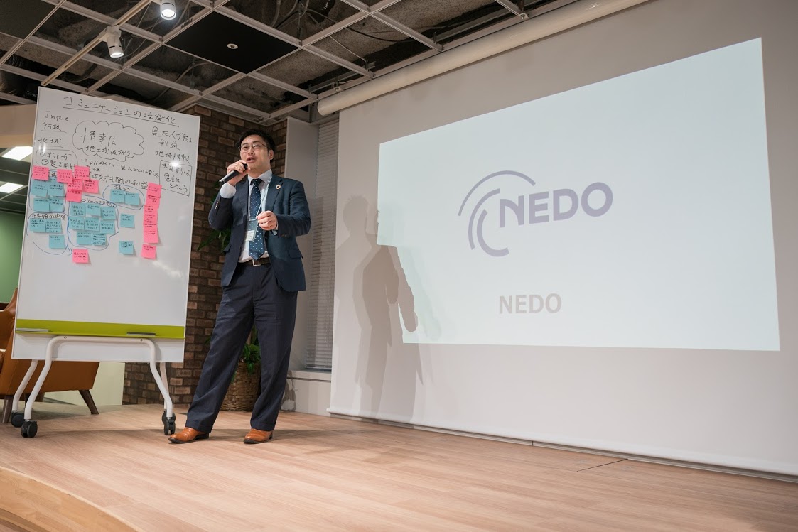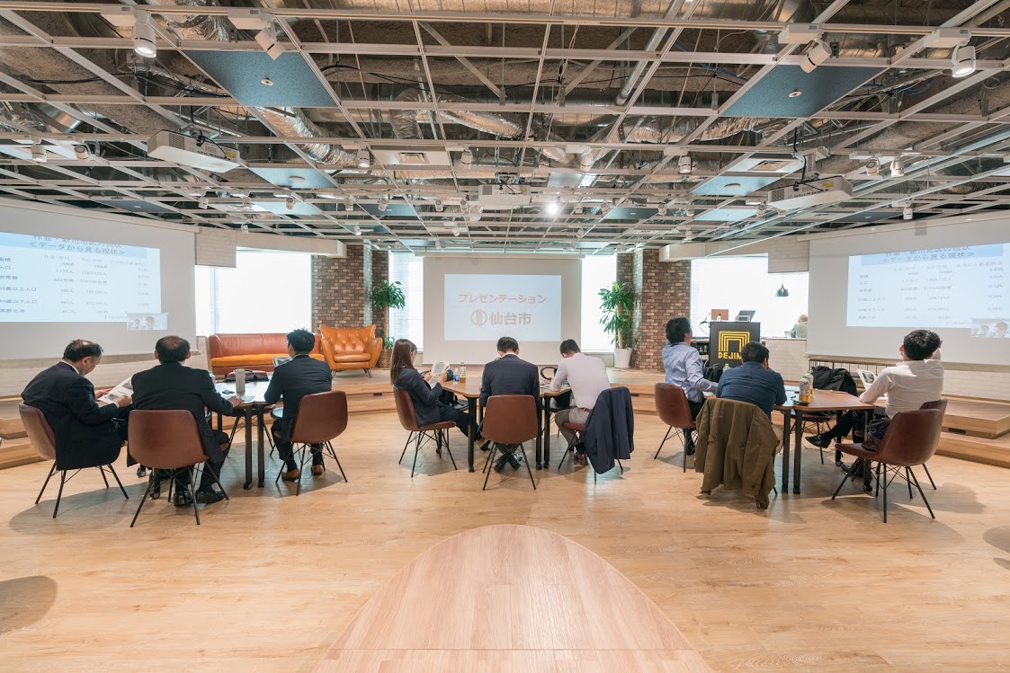 今回、プレゼンテーションを行ったのは「仙台市」、そして参加したは「株式会社Blue Lab」、「KROW株式会社」、「富士通株式会社」、「NEDO(国立研究開発法人新エネルギー・産業技術総合開発機構)」の4つのチームとなります。各チームは3名ずつとなります。