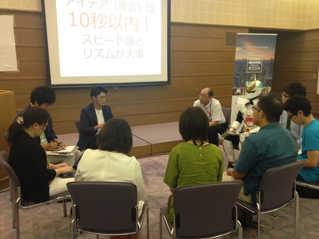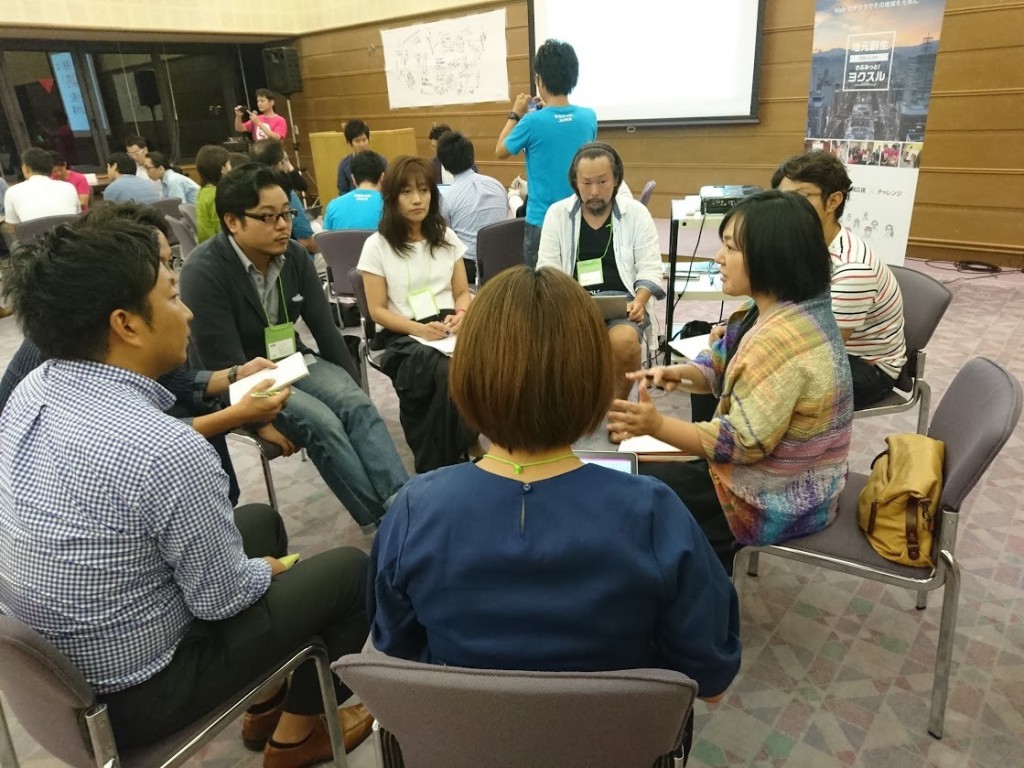第1部「ヨクスル」では、地元の方がプレゼンターとなり地元でこんなことがやりたい!こんなことを広めたい!こんなことを知ってもらいたい!などを発表してもらいます。その発表をもとに参加者のみなさんで5~6名のグループに分かれてアイデア出しを行います。