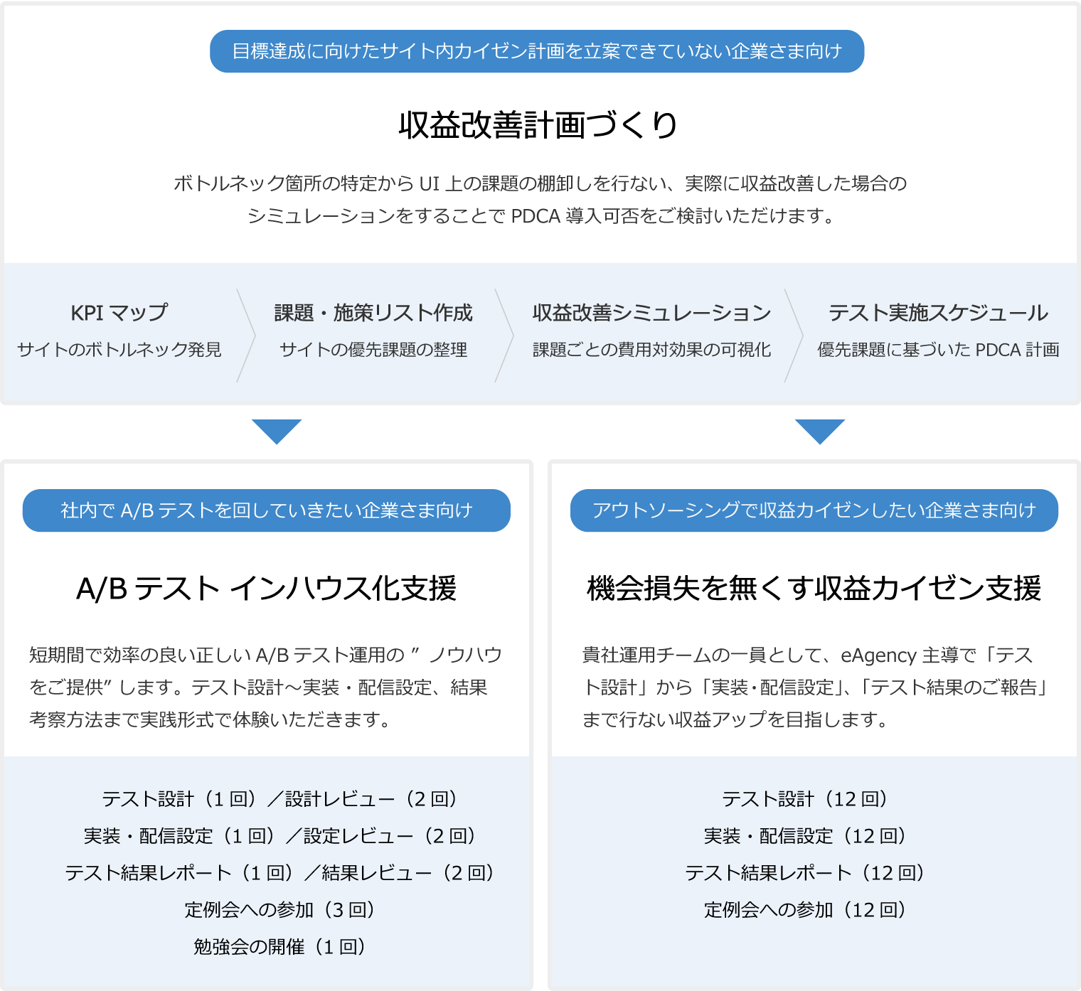 アクセス解析データを活用した俯瞰でみるボトルネック箇所の特定からサイトの優先課題の整理、施策ベースの改善シミュレーションからのA/Bテスト計画立案を支援します。また、スムーズなA/Bテスト導入をサポートするインハウス化支援や、収益アップを目的としたフルアウトソーシングメニューもご提供しております。