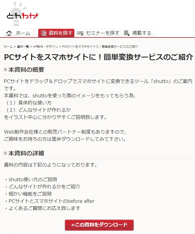 ミロク情報サービスが運営する「とれわか」という資料ダウンロードサイトに スマホ変換shuttoの資料を掲載してもらいました。